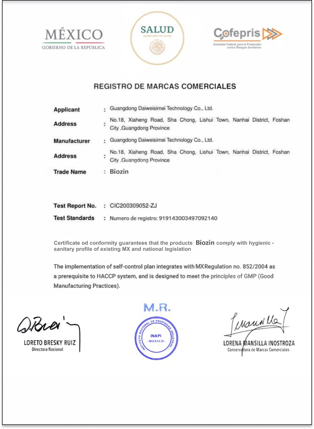 EL PRODUCTO ESTÁ CERTIFICADO POR LA SECRETARIA DE SALUD, NÚMERO NO. 29 982 DE 30 000